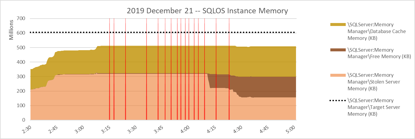It just so happens I have some graphs. Each of the red vertical lines below is an OOM. Usually in a graph like this I have [Stolen Server Memory] at the top of the stacked graph, with [Free Memory] and [Database Cache Memory] below it. Like this...
